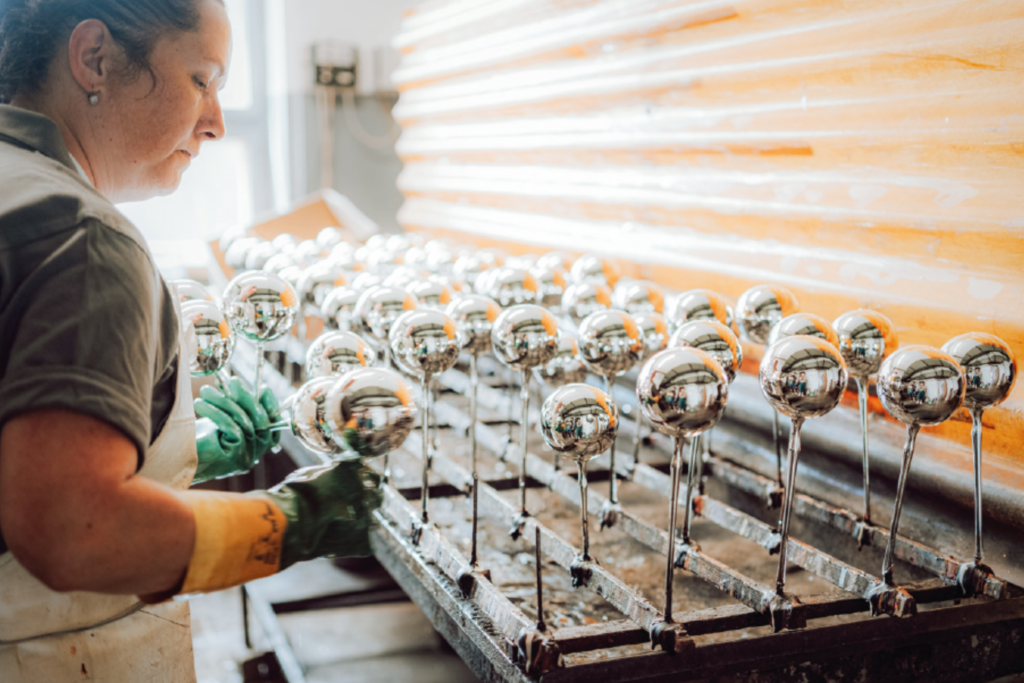 Každá jejich ozdoba je originál a vzniká přímo v Jičíne, kde mají celý proces výroby pevně v rukou – od návrhu, foukání a stříbření pres smáčení, dekorování až po balení a expedici.