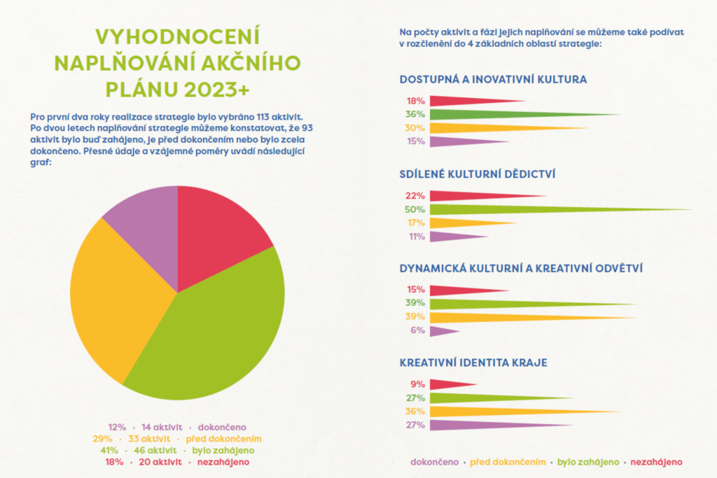 Grafické vyhodnocení níže ukazuje, jak se kraj vypořádává s naplňováním strategie napříč čtyřmi hlavními oblastmi: dostupnou a inovativní kulturou, sdíleným kulturním dědictvím, dynamickými kulturními a kreativními odvětvími a kreativní identitou kraje. Právě zde je vidět největší posun. Tři oblasti naplňování běží výrazně nadpolovičním tempem, což kulturním aktérům otevírá prostor pro nové možnosti spolupráce, zapojování veřejnosti i rozvoj profesního zázemí.