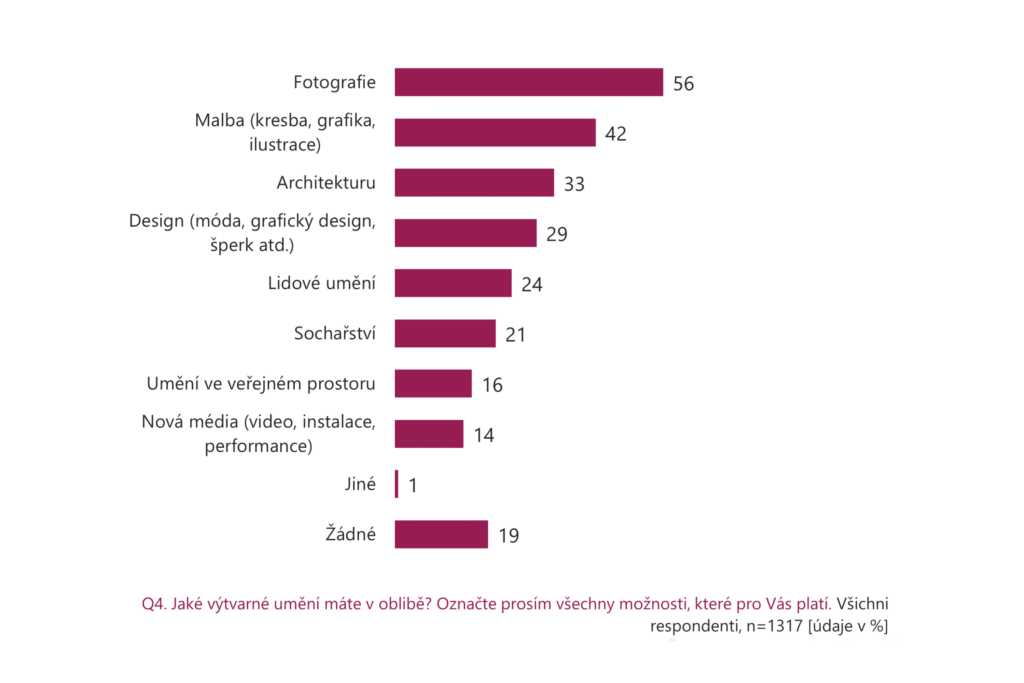 Nejblíž k divákovi má fotografie. Tu má rádo více než polovina lidí. Malba si drží solidní pozici, oslovuje zhruba čtyři z deseti obyvatel. Architektura, kterou denně míjíme, ale ne vždy ji vnímáme jako umění, zaujímá třetinu populace.